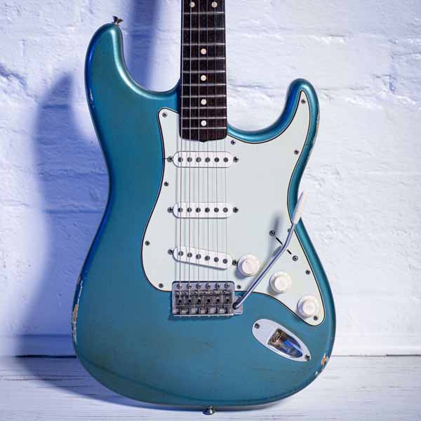 Fender Stratocaster 1963 Lake Placid Blue Rosewood Neck Green Nitrate Guard Black Bobbin Pickups Internally/Externally Original Except as follows: Period Correct Body and Neck Finish Condition: 8/10 Sound/Tone: Optimum sounding, playing '63 Stratocaster Comments This is a classic '63 Stratocaster that carries a later aged period-correct body and neck finish that is indistinguishable from that of a factory original. |